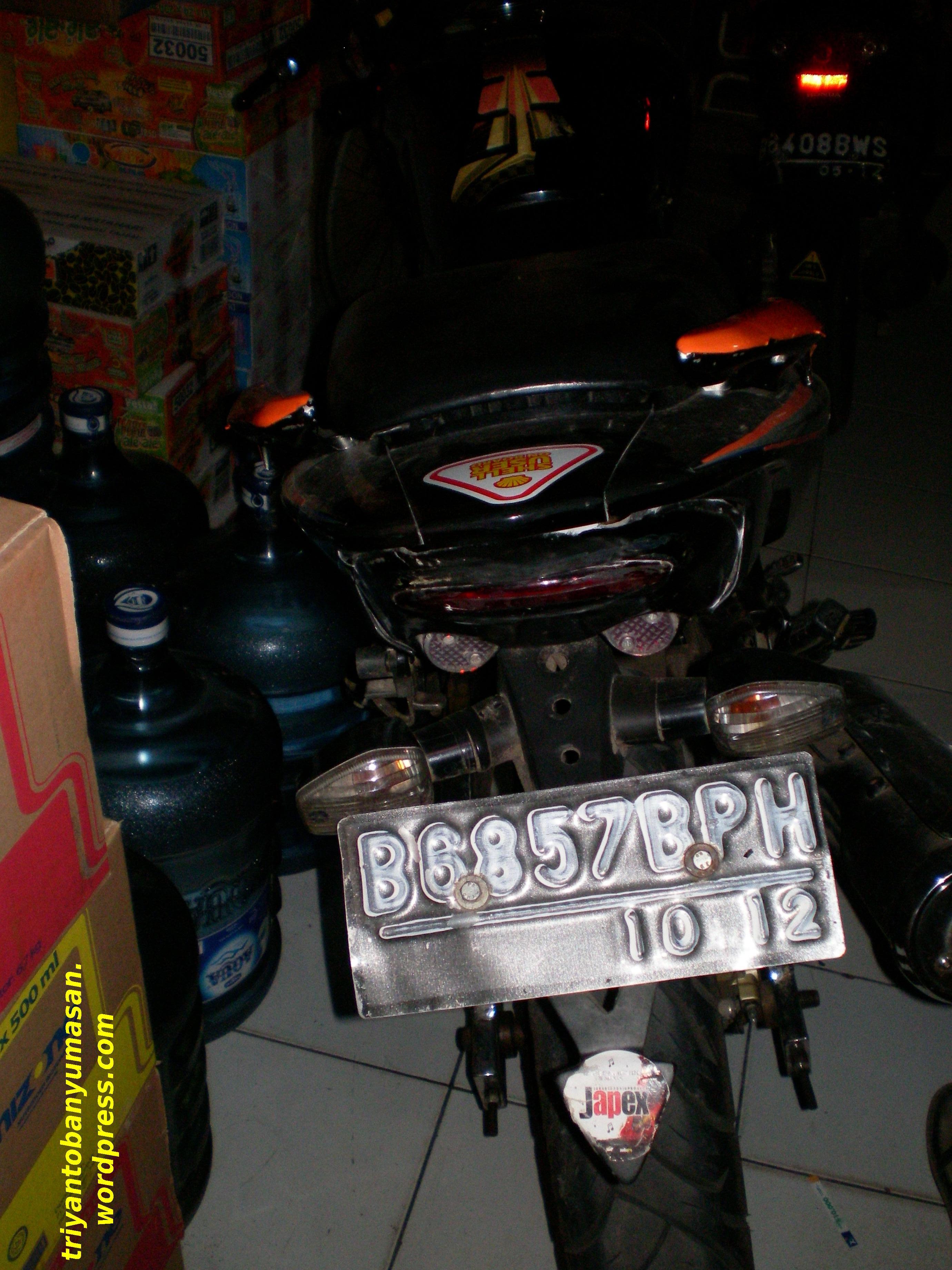 kelitan kan kalo ini not rcomended.. Ya pertama emang karena bosan akan tampang motor yang dipakai tiap hari… akhirnya ganti kolong si Tagor pakai variasi sekaligus stoplamp dan sein.. ternyata variasi ini ga pakai spatbor dan dudukan plat nomor… wah bisa ditangkep polisi kalo maksain neh. Apalagi sein bawaan variasi ini tidak berfungsi karena daya/Watt lampu yang cuma 5 watt, orinya Tiger 20 wattan… Akhirnya nanya sama bengkel modif harga variasi buntut N250 yang undertail anti kemapanan dari stainless .. ternyata harganya 150.000,- tapi ga ready stock alias indent… aku pesen warna putih aja… Eee dasar mujur saat lagi ngotak-atik motor dikerjaan tahu-tahu temen yang pakai N250 yaitu Bro Yasino nawarin variasi ini gratis, karena dah Dia beli tapi ragu mo masang.. (nyepret pastinya kalo ujan)… meski beda bahan tapi lumayanlah gratis gitu lho… dan pemesanan saya batalin sepihak…