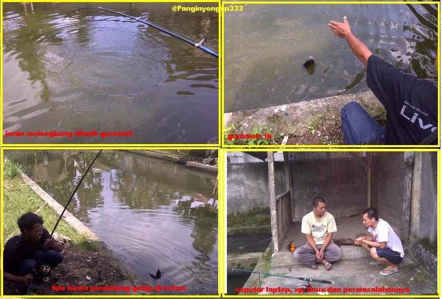 Selanjutnya aku kembali straiik dengan Gurameh yang lumayan besar, tarikannya bikin takut tali putus, kuulur sejenak sebelum akhirnya kuangkat dengan joran yang melengkung, meski mata kail nyangkut di tenggorokan, tapi ikan tidak terluka, maka ikan kembali dilepas, dan suatu saat akan kupancing kembali untuk dibakar, tentu jika ada waktu tuk kembali nyambangi Sarang Walet… Jam menunjuk 14 lewat, …srottt..hidung ini susah diajak kompromi..terus mengalirkan isinya… kembali ke rumah untuk progres XP Kang Sapto.. Selanjutnya aku pamit karena ada urusan keluarga, yah waktu sangat pendek, padahal niatnya belajar linux.. Yowes.. Matur suwun Kang Elsa Barto dan keluarga yang sudi menjamu dan direpotkan olehku. Mudah-mudahan kelak bisa bakar ikan Gurameh bareng para Kumbokarno…