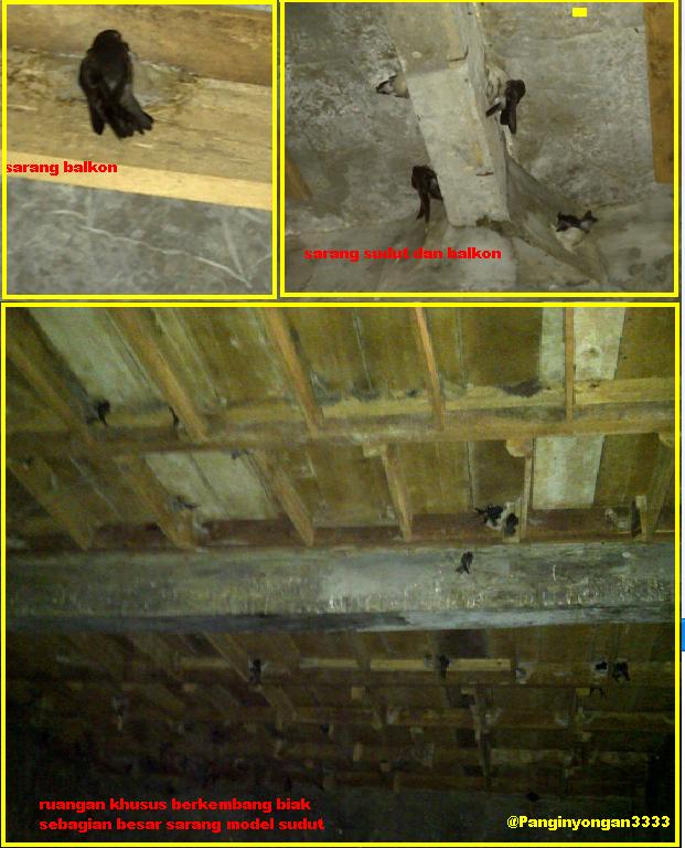 Beberapa ekor walet sedang sibuk menunggu sarang, model balkon yang paling mahal harganya juga sedang dibangun, tak bergeming meski kami bertiga ngobrol di bawahnya persis. Model sudut menempel di pojokan.. Saat membuka ruangan sebelah yang paling ramai, dan memotret, beberapa ekor walet terbang ke arah kami, menyerang mempertahankan diri, pertanda banyak telur dan anak walet di sarang-sarang tersebut.