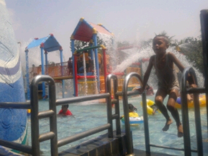 Kebetulan hari ini anak saya si kembar ‘dampit’ mengajak berenang. Tidak berenang sungguhan, mereka hanya mainan air di kolam anak, ciprat-cipratan, berendam dan prosotan tentunya. Hasilnya