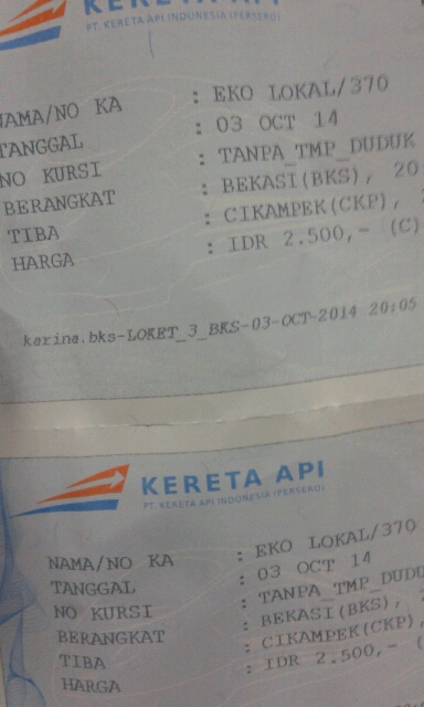Perjalanan cukup lancar, sampai stasiun jam 20.06, segera menuju loket dan menebus 4 lembar tiket kereta api lokal Jakarta – Cikampek, karena anak bontot saya belum genap setahun jadi tidak dihitung satu tiket. Dihitung satu tiket jika sudah berumur 3 tahun atau lebih.