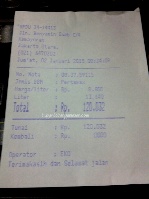 Saya isi tangki Jalitheng Pulsar 220 full di SPBU Kemayoran. SPBU pertamina ini cukup terpercaya takaran dan pelayanannya. SPBU yang berkode 34 – 14413. Kode 34 di awal menandakan bahwa SPBU ini milik swasta, bukan milik Pertamina atau COCO tapi DODO atau CODO. Angka 3 menandakan wilayah atau region Jakarta, sedang angka 4 kode tipe SPBU.