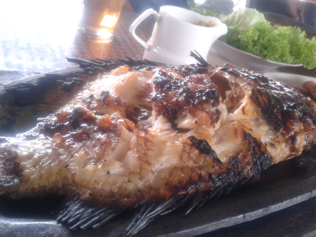 Pesanan datang. Segera kami memenuhi panggilan perut yang memang sudah menagih janji untuk diisi. Hap, hap, hap. Suap demi suap mulai memenuhi mulut kami. Tidak salah, gurameh bakar disini rasanaya nylekamin alias mak nyuss. Entah karena lapar atau memang rasanya yang pas di lidah kami. Tapi semua sepakat, rasa gurameh bakar resto abah’9 Subang ini enak. Sop Gurameh juga mak nyuss. Sayang, cah kangkung rasanya terlalu manis, bahkan sangat manis bagi yang kurang suka rasa makanan manis. Akhirnya sisa makanan dibagikan ke penghuni kolam, yaitu ikan mas yang kelaparan. Lha wong timun aja doyan 😀 .