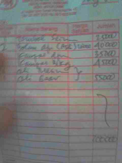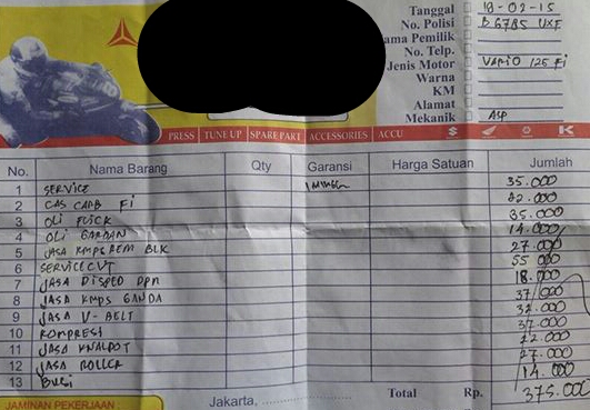Kalo di nota tertulis seperti up grade CB seperti di atas ya wajar, kalo jasa copot knalpot saja karena ganti knalpot doang, juga wajar. Tapi kalo service yang memang mengharuskan bengkel membongkar beberapa part yang nempel di kendaraan dan ditulis masing-masing jasanya, ini luar biasa menurut saya.(tri)