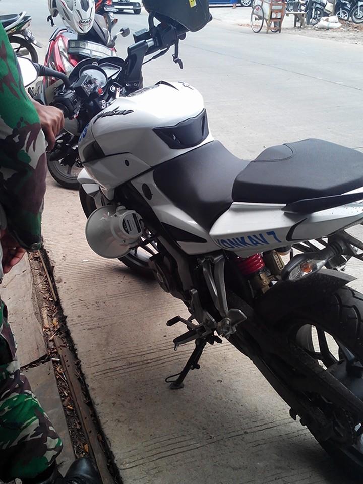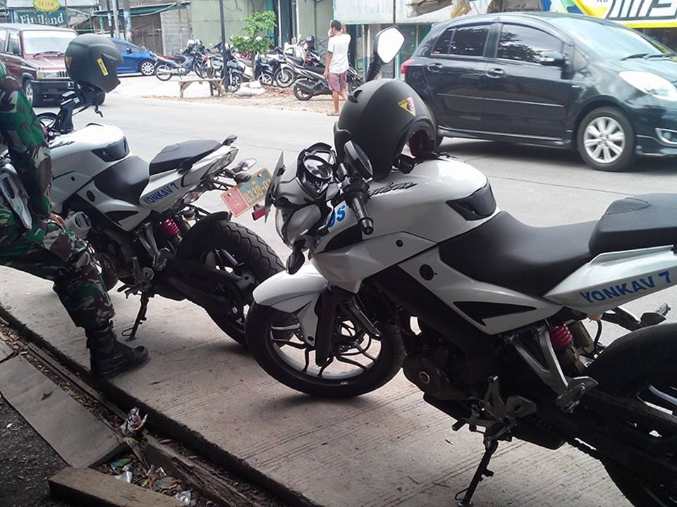 Nah selanjutnya hal yang memicu tulisan ini, yaitu sepeda motor Kawasaki Bajaj Pulsar 200 Ns warna putih dengan tulisan warna biru di samping bodi belakang menyerupai stripping “YONKAV 7”