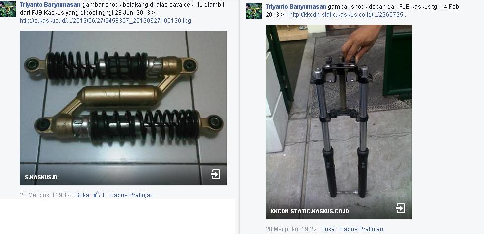 Ternyata kedua gambar dagangan, baik shock depan maupun shock belakang Honda Tiger di facebook adalah berasal dari postingan forum jual beli di Kaskus.