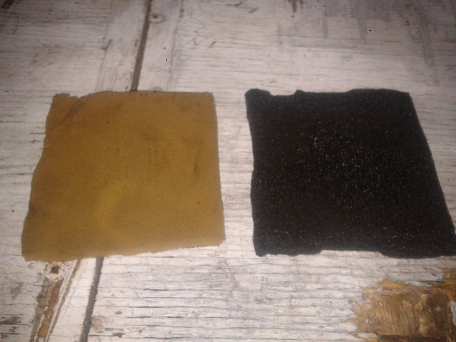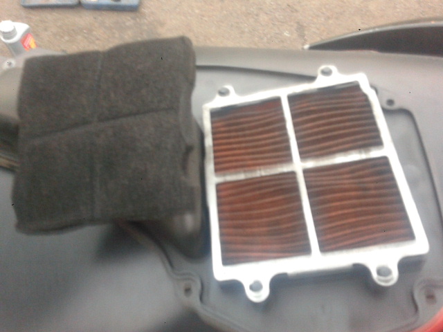 sudah lapuk dan kotor Cabut dengan perlahan busa filter, kalo masih layak, cuci dengan bensin. Busanya saja ya, jangan kisi kisi merah bata itu. Gambar di atas kondisi busa sudah saya cuci, ternyata masih kotor dan busa sudah agak lapuk. Sehingga saya ganti pakai busa alternatif
