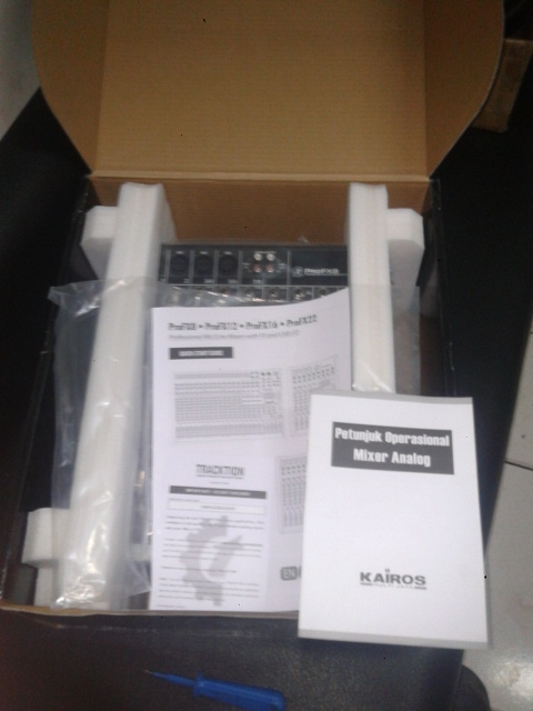 Nampak isi dus, berupa 1 unit mixer, manual book, kartu sertifikasi, kartu garansi dan manual book kecil berbahasa Indonesia dari ATPM Indonesia yaitu PT Kairos Multijaya