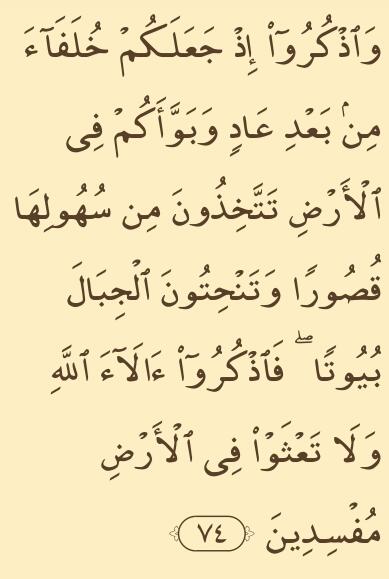 Tempat yang tertinggi (Al-‘A`rāf):74 – Dan ingatlah olehmu di waktu Tuhan menjadikam kamu pengganti-pengganti (yang berkuasa) sesudah kaum ‘Aad dan memberikan tempat bagimu di bumi. Kamu dirikan istana-istana di tanah-tanahnya yang datar dan kamu pahat gunung-gunungnya untuk dijadikan rumah; maka ingatlah nikmat-nikmat Allah dan janganlah kamu merajalela di muka bumi membuat kerusakan.