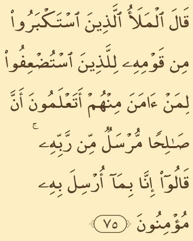Tempat yang tertinggi (Al-‘A`rāf):75 – Pemuka-pemuka yang menyombongkan diri di antara kaumnya berkata kepada orang-orang yang dianggap lemah yang telah beriman di antara mereka: “Tahukah kamu bahwa Shaleh di utus (menjadi rasul) oleh Tuhannya?”. Mereka menjawab: “Sesungguhnya kami beriman kepada wahyu, yang Shaleh diutus untuk menyampaikannya”.