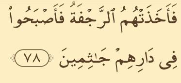 Tempat yang tertinggi (Al-‘A`rāf):78 – Karena itu mereka ditimpa gempa, maka jadilah mereka mayat-mayat yang bergelimpangan di tempat tinggal mereka.