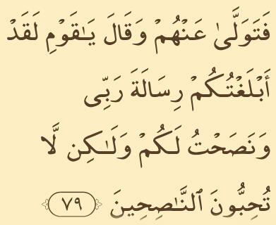 Tempat yang tertinggi (Al-‘A`rāf):79 – Maka Shaleh meninggalkan mereka seraya berkata: “Hai kaumku sesungguhnya aku telah menyampaikan kepadamu amanat Tuhanku, dan aku telah memberi nasehat kepadamu, tetapi kamu tidak menyukai orang-orang yang memberi nasehat”.