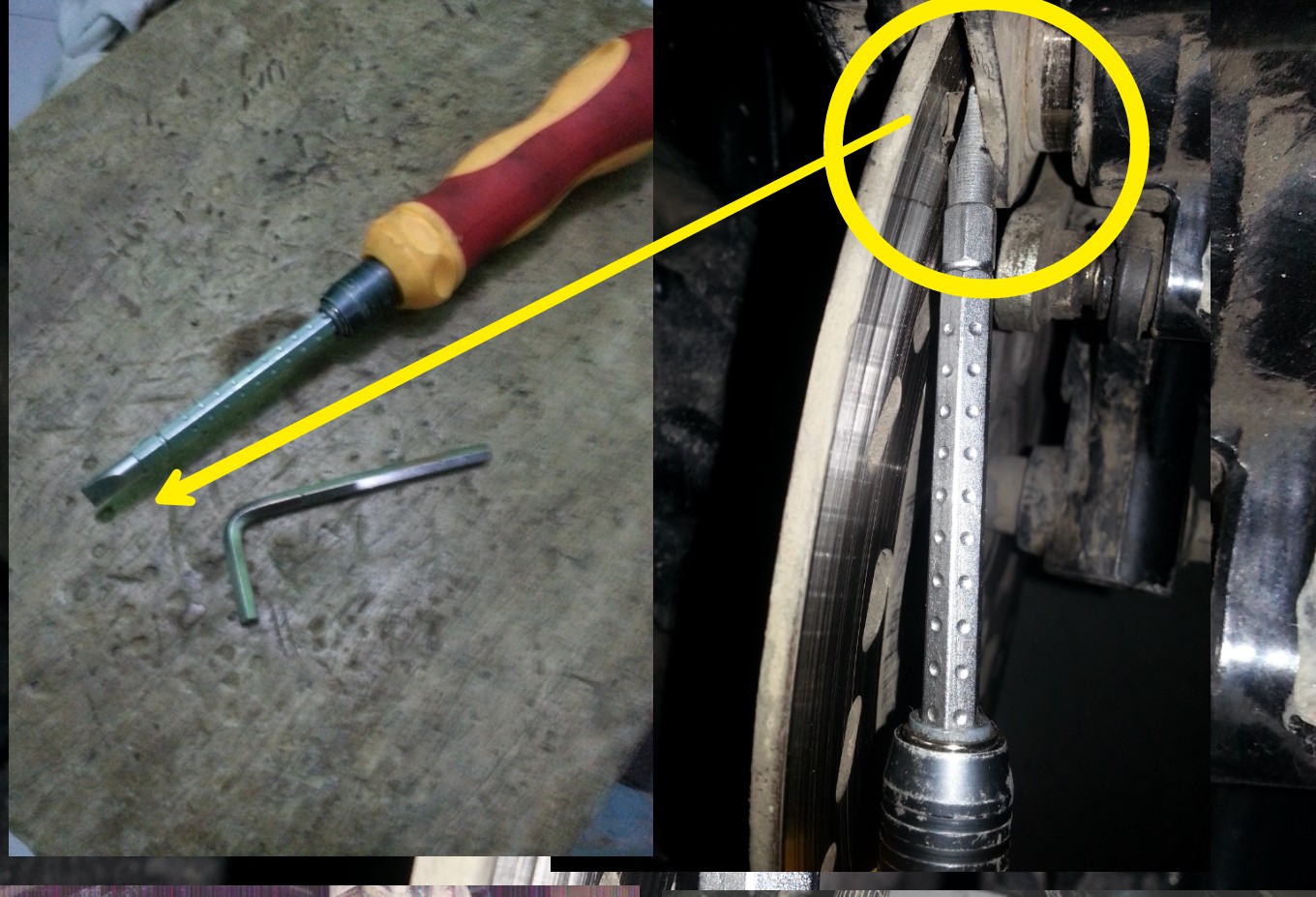 2. Ungkit disk pad dengan obeng min (-) pada bagian luar, antara disk dan kampas seperti gambar. Hal ini bertujuan melonggarkan jepitan piston, longgarkan sampai maksimal.