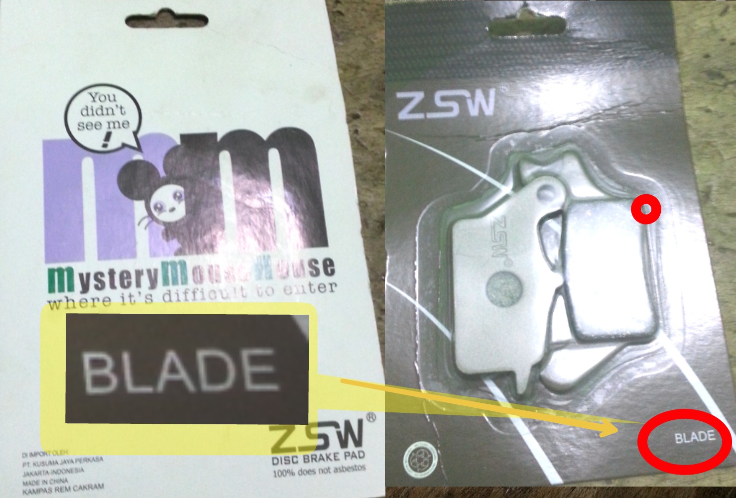 Saat saya tanya disk pad atau kampas rem depan Suzuki Hayate, saya dikasih pilihan, pakai Honda Blade KW atau original SGP, keduanya sama bentuk dan ukuran. Suzuki Genuine Part untuk disk pad merk Nissin, sedang KW Honda blade bermerk ZSW.