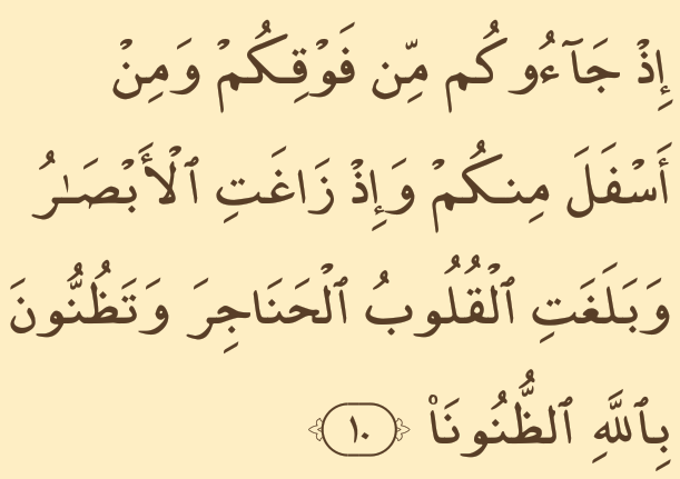 Golongan-Golongan yang bersekutu (Al-‘Aĥzāb):10 – (Yaitu) ketika mereka datang kepadamu dari atas dan dari bawahmu, dan ketika tidak tetap lagi penglihatan(mu) dan hatimu naik menyesak sampai ke tenggorokan dan kamu menyangka terhadap Allah dengan bermacam-macam purbasangka.