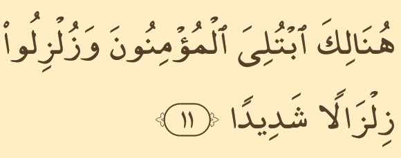 Golongan-Golongan yang bersekutu (Al-‘Aĥzāb):11 – Disitulah diuji orang-orang mukmin dan digoncangkan (hatinya) dengan goncangan yang sangat.