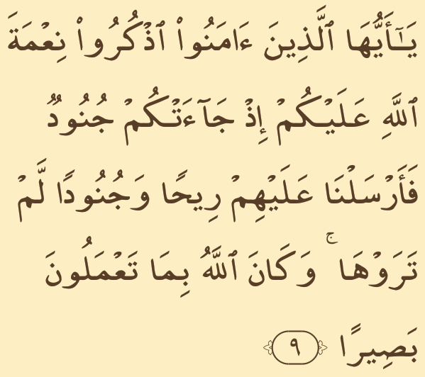 Golongan-Golongan yang bersekutu (Al-‘Aĥzāb):9 – Hai orang-orang yang beriman, ingatlah akan nikmat Allah (yang telah dikurniakan) kepadamu ketika datang kepadamu tentara-tentara, lalu Kami kirimkan kepada mereka angin topan dan tentara yang tidak dapat kamu melihatnya. Dan adalah Allah Maha Melihat akan apa yang kamu kerjakan.