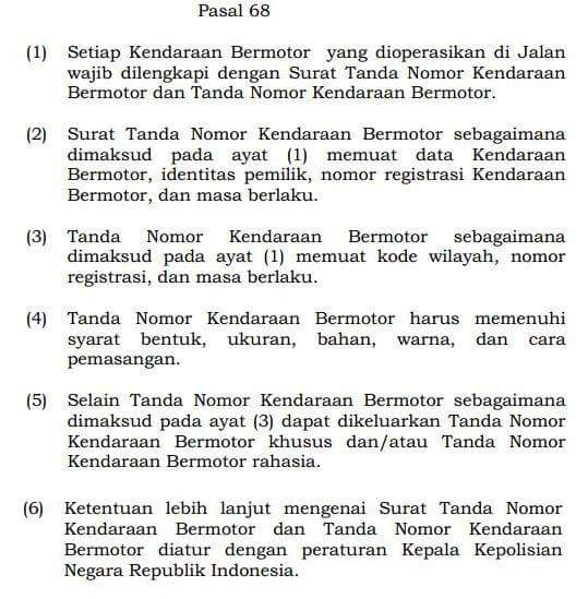 “Pasal 280 : Setiap orang yang mengemudikan Kendaraan Bermotor di Jalan yang tidak dipasangi Tanda Nomor Kendaraan Bermotor yang ditetapkan oleh Kepolisian Negara Republik Indonesia sebagaimana dimaksud dalam Pasal 68 ayat (1) dipidana dengan pidana kurungan paling lama 2 (dua) bulan atau denda paling banyak Rp500.000,00 (lima ratus ribu rupiah).”