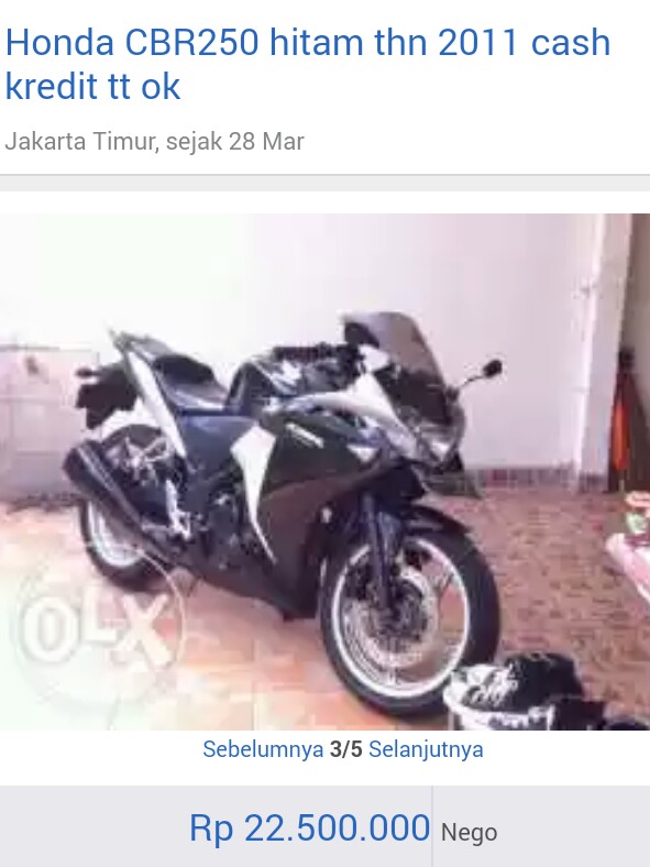 Sebagai Homosek Kampak Merah, saya jadi penasaran, akhirnya ikutan iseng cari sepeda motor second CBR 250 di OLX. Oh iya, bagi yang penasaran dengan istilah HOMOSEK Kampak Merah, ini adalah istilah dari Pak Muhsin penunggu Warung Typo eh Bonsai, yang merupakan singkatan dari Hobi Motor Second, Kantong Cepak amaunya Murah.