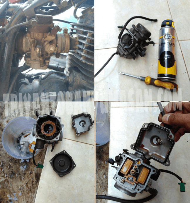 Proses selanjutnya bongkar karburator, mulai dari baut bak bensin, pilot jet, main jet, baut setelan udara, baut pembuangan bensin, karet vacum. Lalu bersihkan menggunakan carb Cleaner atau pakai bensin.