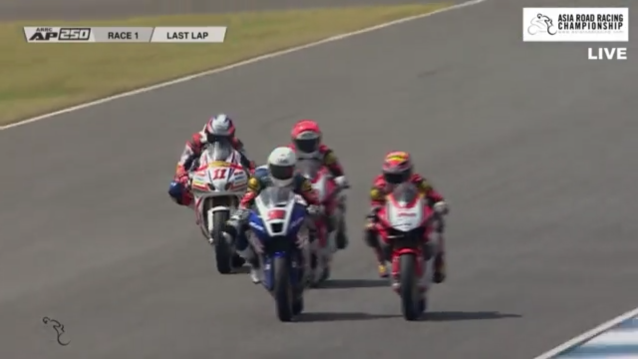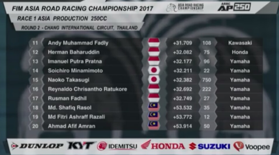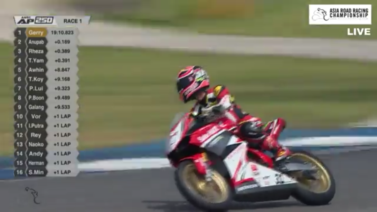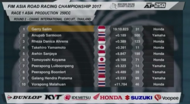 Hasil balap ARRC 2017 kelas 250 CC atau Asian Produce 250 (AP-250), Race 1, Jumat 14 April 2017, di sirkuit Chang Internasional, Buriram, Thailand. Gerry Salim, rider Indonesia yang mengendarai Honda CBR 250 RR, yang start dari urutan ke-2, kembali meraih podium 1.
