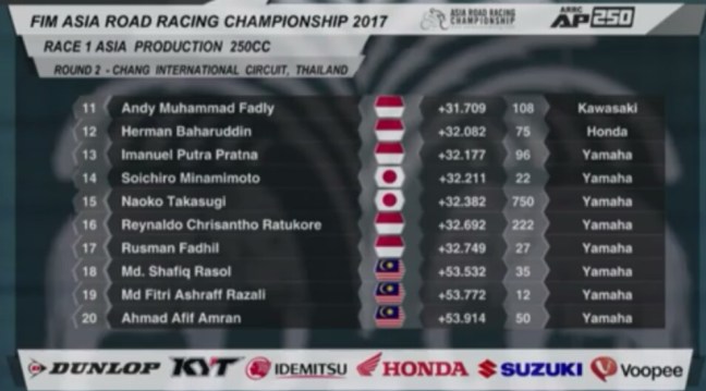 Berikut hasil lengkap Race 1 ARRC serie 2, 2017 di Chang International Circuit, Buriram, Thailand.