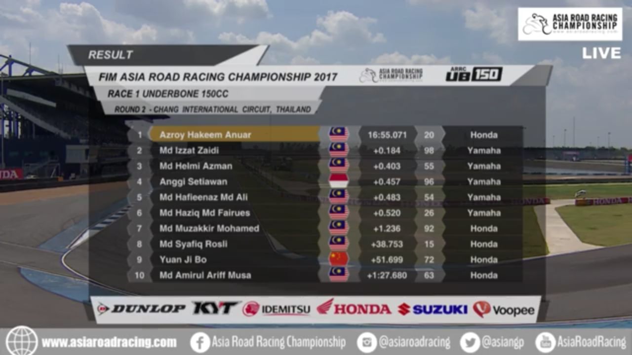 Kelas bebek alias Underbon 150cc atau UB 150 pada ARRC gelaran kedua di Chang Circuit Thailand, Race 1, Jumat 14 April 2017, podium 1 sampai 3 diisi oleh rider Malaysia.