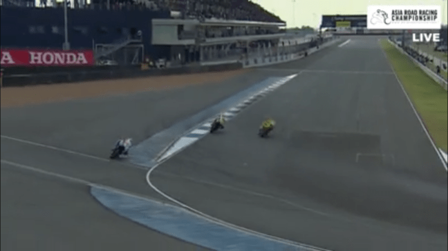Decha memaksa motornya berbelok dari sisi dalam tikungan, ternyata handling sepeda motor seolah melawan, berakibat Yamaha YZF-R6 yang dikendarainya, ngeloyor keluar lintasan dan menguntungkan 2 pebalap lain yang melakukan cornering dari sisi luar tikungan.