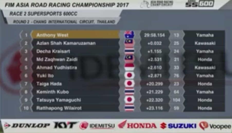 - Podium 1 diraih oleh pebalap asal Filipina, Anthony West, yang mengendarai Yamaha R6. Pada race 1, Anthony finish podium 3, podium 1 diraih Azlan Shah Kamaruzzaman