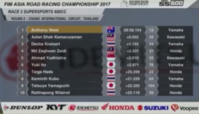 - Podium 2, diisi pebalap asal Malaysia, Azlan Shah Kamaruzzaman, yang merupakan rekan satu tim pebalap Indonesia, Ahmad Yudhistira. Mengendarai Kawasaki ZX-600. Turun 1 podium dari race1