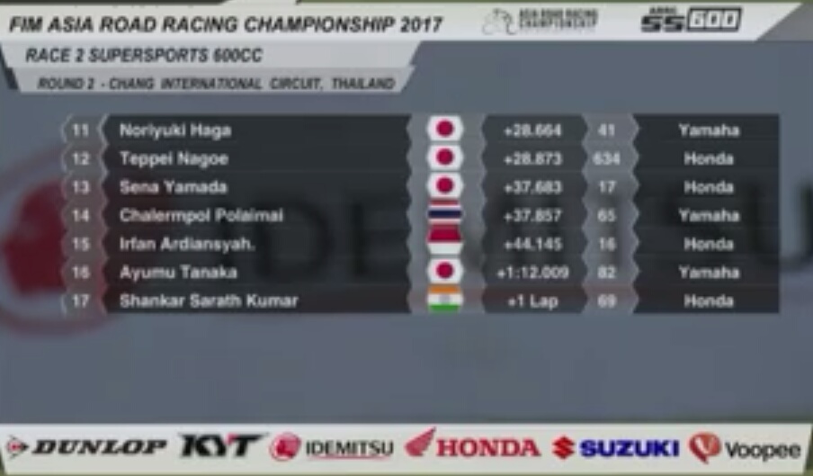 Sementara Pebalap Indonesia, Ahmad Yudhistira, harus puas finish posisi 5, menurun 1 peringkat dibanding Race 1. Saat race 1, Yudhistira Finish di urutan 4. Pebalap Indonesia lainnya, gemblengan AHRT, Irfan Ardiansyah kurang beruntung, finish pada Row terakhir, urutan 15. Padahal pada race1, Irfan berhasil meraih posisi 8. Semakin menurun dibanding serie pertama di Johor, Malaysia. Nampaknya ada kendala pada mesin CBR-600 yang dikendarainya. Kabarnya, jelang starting, motornya masih dioprek mekanik di paddock. Masih bisa dianggap beruntung, dibanding Pebalap AHRT lainnya di kelas AP250, Gerry Salim yang gagal ikut race (klik Gerry Salim gagal ikut balap AP250 race 2 ARRC Buriram). Kabar miring menyertai ketidak ikut sertaaan Gerry. Ada yang bilang, tim lain mencurigai ada kecurangan pada mesin motor CBR 250RR yang dikendarainya, sehingga motornya diminta untuk dibongkar. Hal ini dianggap membuat Gerry tidak ikut balap. Entah benar atau tidak.