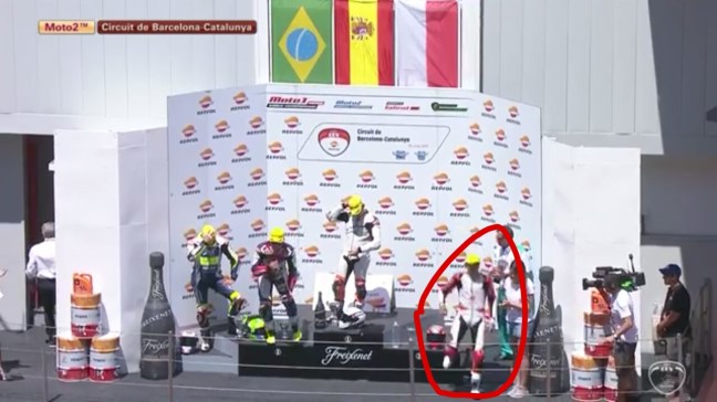 Sama halnya saat pebalap Malaysia, Hafizh Syahrin HS|55 memenangi serie pertama balap Moto2 Eropa di sirkuit Albacete, yaitu selebrasi yang berbeda. Syahrin tidak pakai sampanye.
