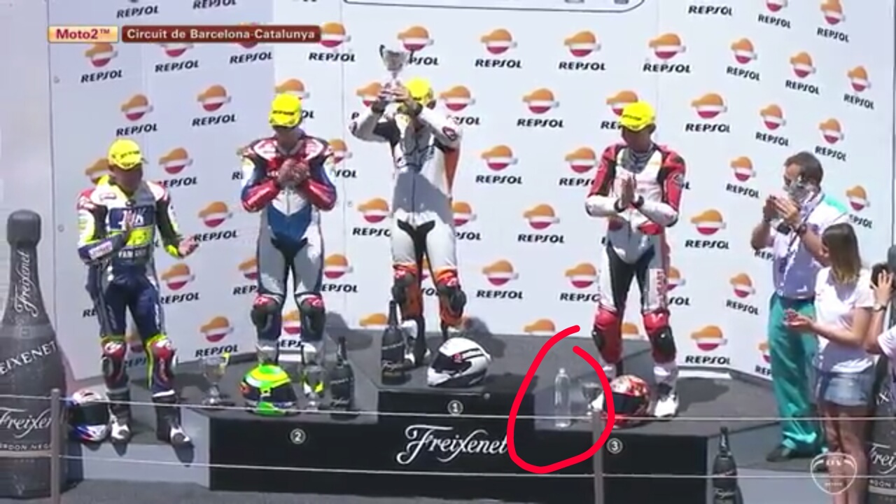 Begitu juga dengan Dimas Ekky #20, jika pebalap lain menyanding botol sampanye besar, Dimas Ekky cukup air putih (nampak seperti air mineral). Atau mungkin minuman bersoda. Tapi yang jelas botolnya bening tanpa emblem apapun. Sedang pebalap lain menyanding botol sampanye dengan emblem Freixenet. Yang merupakan minuman sampanye, original partner balap otomotif, termasuk MotoGP.
