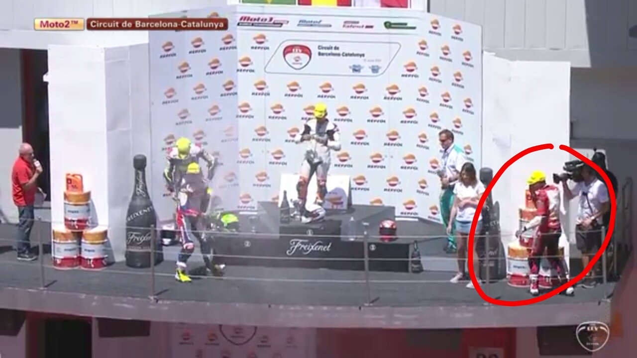 Sama halnya saat pebalap Malaysia, Hafizh Syahrin HS|55 memenangi serie pertama balap Moto2 Eropa di sirkuit Albacete, yaitu selebrasi yang berbeda. Syahrin tidak pakai sampanye.