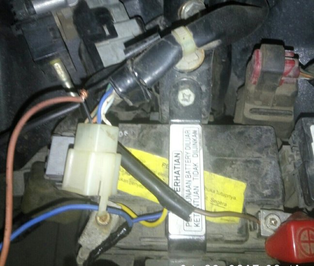 - Kabel cokelat merupakan power charger, saya konek langsung ke positif accu, sehingga, meski kontak motor off, charge tetap bisa dipakai.