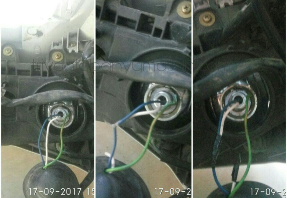 Akhirnya, lampu kanan Vario yang reflektornya meleleh, saya hidupkan lagi, tapi khusus untuk lalu jauh saja. Kabel lampu dekat saya putus (warna putih), saya kupas kabel lampu jauh (warna biru). Kedua kabel menuju filamen dekat dan jauh saya satukan di kabel power untuk lampu jauh. Sedang kabel lampu dekat (warna putih saya isolasi, niatnya saya mau pasang lampu tambahan atau variasi. Nantinya kabel tersebut buat power lampu tambahan.