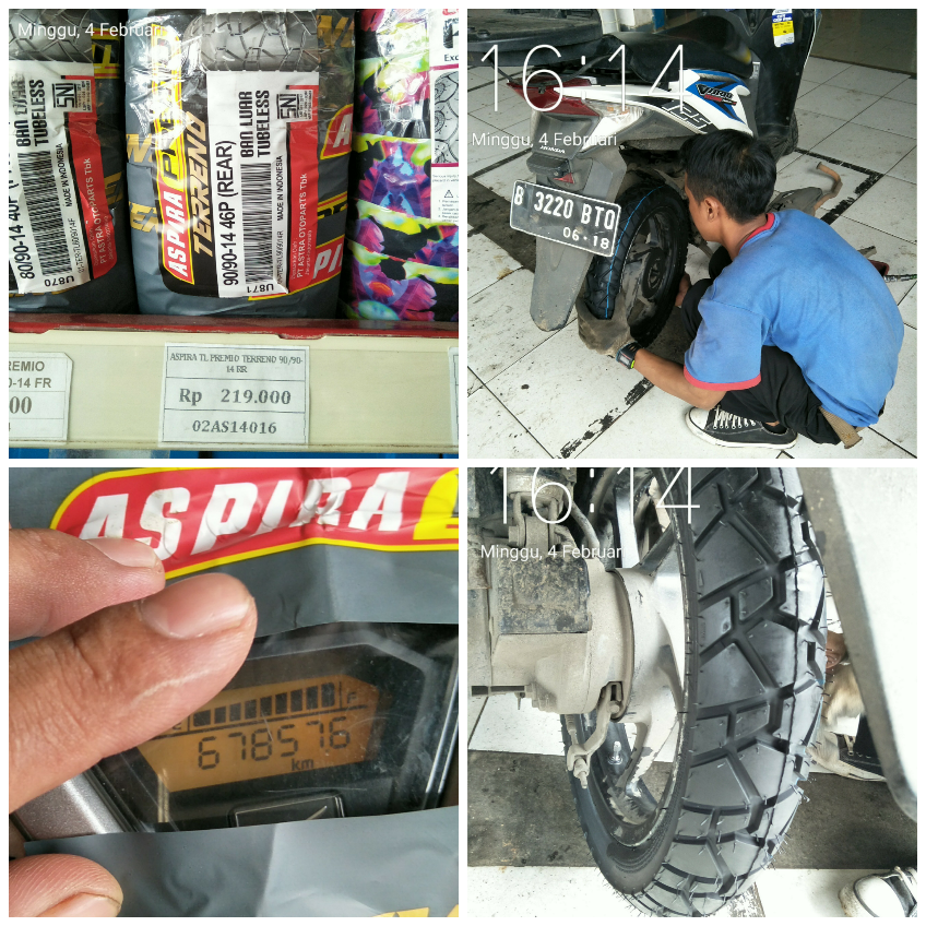 Aspira Premio Terreno, ban lokal semi Enduro, hasil kerjasama Aspira dan Pirelli, saya sebut Pirelli Scorpion versi generik. Ya, ban ini pernah saya adopsi beberapa waktu silam, sebelum beralih ke Pirelli Diablo Scooter, pemasangan Aspira Premio Terreno bisa di baca di Premio Terreno dan Naga Ngglundung. Kali ini saya kembali memilih si Terreno karena saya anggap cukup baik dengan harga di bawah banderol Pirelli Diablo Scooter yang berumur pendek. Penggantian saya lakukan juga di Planet Ban. Pemasangan ban Aspira Premio Terreno kali kedua ini, dilakukan pada 04 Februari 2018, pada angka odometer Vario 67.857,6km. Berarti sudah 3 bulan lebih.