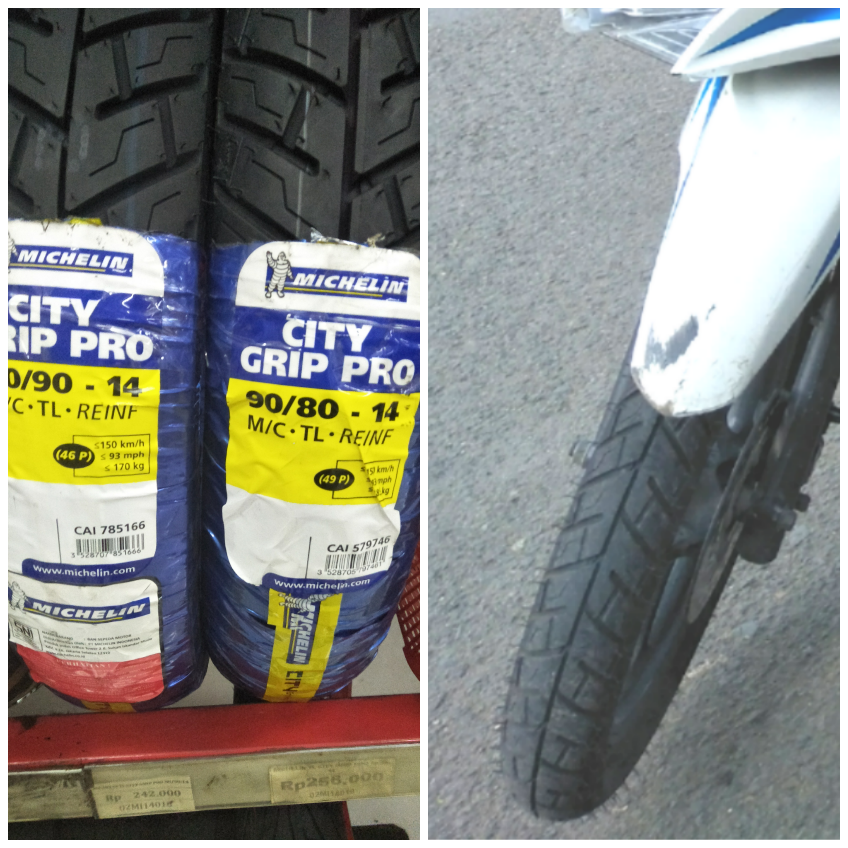 Ban Michelin City Grip Pro, saya aplikasi di ban depan Honda Vario 125, sebagai pengganti ban sebelumnya yaitu Aspira Premio Terreno. Pemasangan sebenarnya masih di tahun 2017, tapi saya lupa persisnya, karena dokumentasi entah di HP yang mana. Kalo tidak salah di bulan November 2017. Ukuran yang dipakai adalah 80/90-14, sesuai ukuran asli ban Vario 125 lawas.