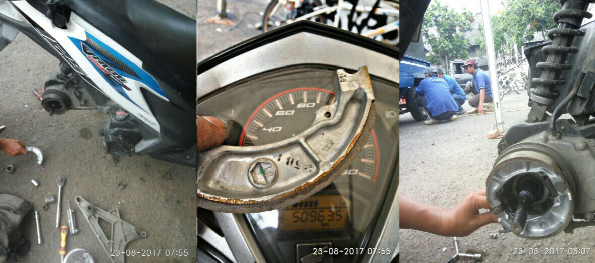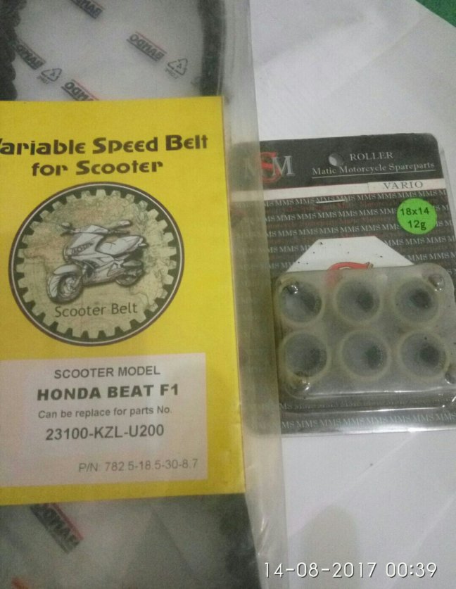 Penggantian ini karena berdasarkan pengecekan sebulan sebelumnya (seperti tanggal foto di atas pada 14 Agustus 2017), bahwa Vanbelt yang saya pasang 7 bulan lalu, sudah mulai retak. Kekhawatiran putus saat berkendara kerap menghantui pikiran saya. Akhirnya saya membeli Vanbelt merk Bando yang diperuntukkan buat Honda Beat fi dengan kode 23100-KZL-U200 dan roller Vario 12gram (ukuran 18×14) merk MSM. Oh iya, Vanbelt Honda memang memakai merk Bando.