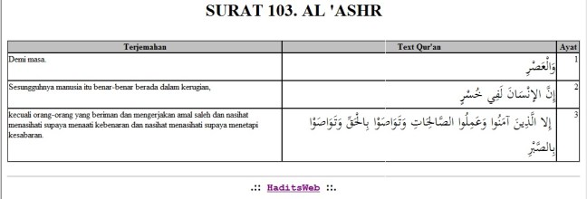 Demi masa (WAKTU). Sesungguhnya manusia itu benar-benar berada dalam kerugian, kecuali orang-orang yang beriman dan mengerjakan amal saleh dan nasihat menasihati supaya menaati kebenaran dan nasihat menasihati supaya menetapi kesabaran.
