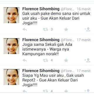 Florence atau entah nama lengkapnya siapa, saya malas browsing menghabiskan energi untuk melihat berbagai cercaan terhadap pengkritik Jogja ini.